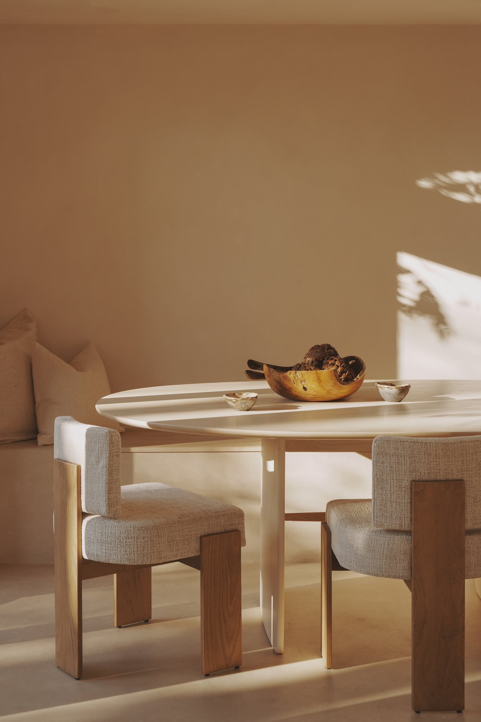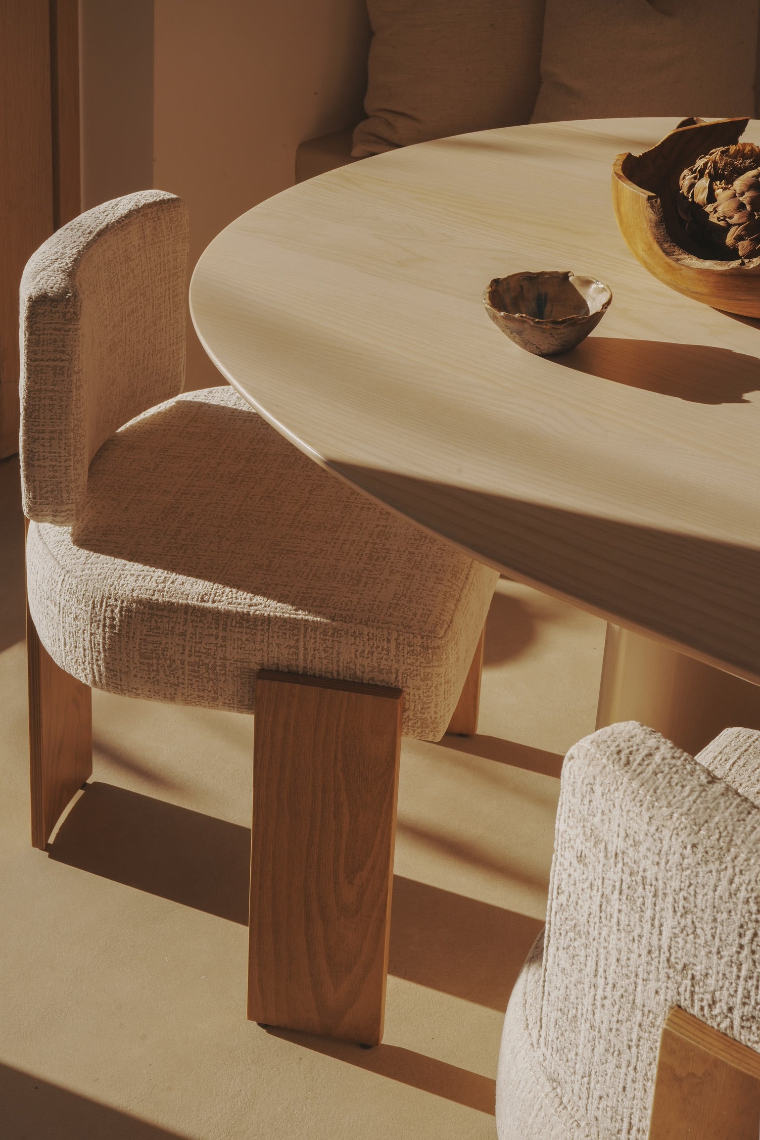 This latest edition sees the iconic Armless Hannah reimagined in a refined teak finish, with comfort enhancements introduced to the seat offering a medium-firm sit that balances support. Upholstered in a rich two-tone chenille, the fabric is exquisitely soft to the touch with a texture feel that plays subtly with light.
